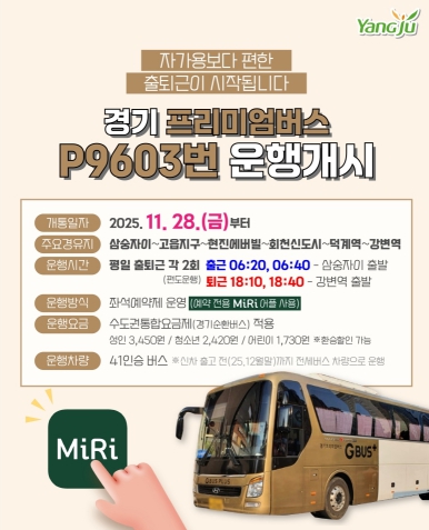 [뉴스노크=김인호 기자] 양주시 삼숭자이에서 서울 강변역까지 운행하는 경기프리미엄 버스 P9603번이 28일부터 본격 운행을 시작했다.