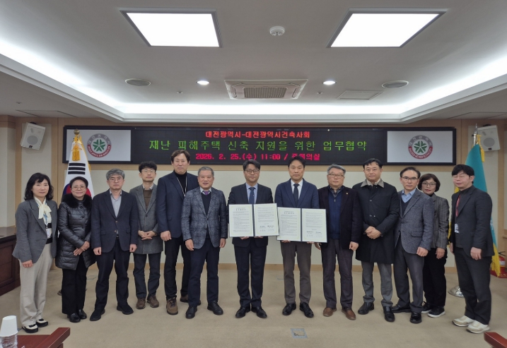 [뉴스노크=김인호 기자] 대전시는 25일 시청 중회의실에서 대전광역시건축사회와 ‘재난 피해주택 신축 지원을 위한 업무협약’을 체결했다.