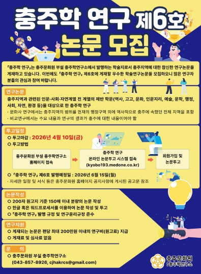 올해에도 '충주학 연구' 제6호에 실릴 충주학 연구논문과 함께 새로운 연구자들의 충주학 학술연구과제를 지원하는 2026년 충주학 신진연구자 학술연구과제 공모를 추진한다.