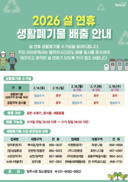[뉴스노크=김인호 기자] 양주시가 설 연휴 기간 시민과 방문객의 불편을 줄이기 위해 ‘2026년 설 연휴 생활폐기물 관리 대책’을 추진한다.