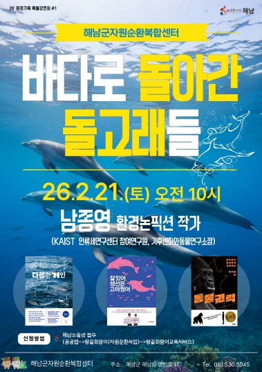[뉴스노크=김인호 기자] 해남군자원순환복합센터는 오는 21일 환경논픽션 작가 남종영을 초청해 ‘바다로 돌아간 돌고래들’특별강연을 개최한다.