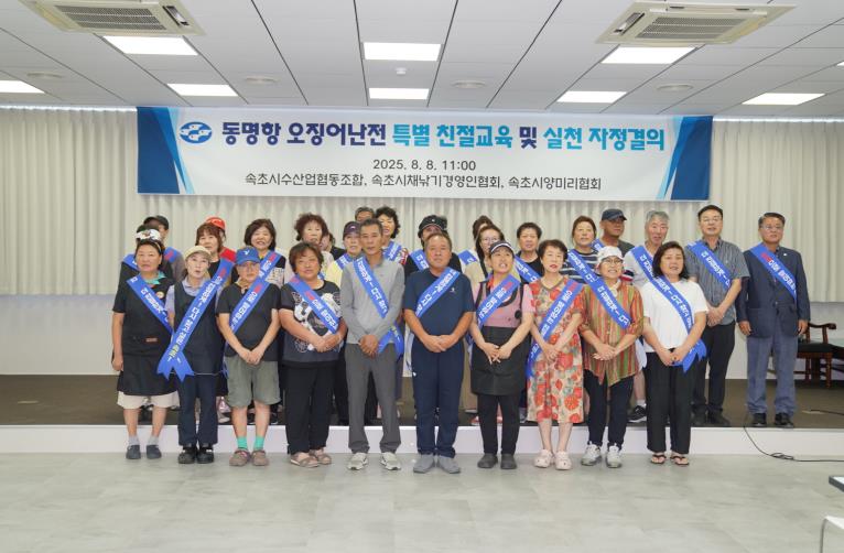 [뉴스노크=김인호 기자] 속초시 동명항 오징어난전 운영 주체인 속초시수산업협동조합과 속초시채낚기경영인협회, 속초시양미리자망협회는 8일 오전, 수협에서 특별 친절교육과 자정 결의대회를 공동으로 개최했다.