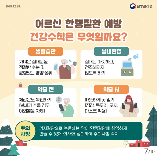 아울러 보건소에서는 경로당 등에 방문해 한랭질환 예방 교육과 홀몸 어르신 등 건강 취약계층의 정기적인 안부 확인, 그리고 관내 병원급 의료기관 6개소의 한랭질환 응급실 감시체계 운영 등을 통해 한랭질환 예방에 적극적으로 노력하고 있다고 전했다.