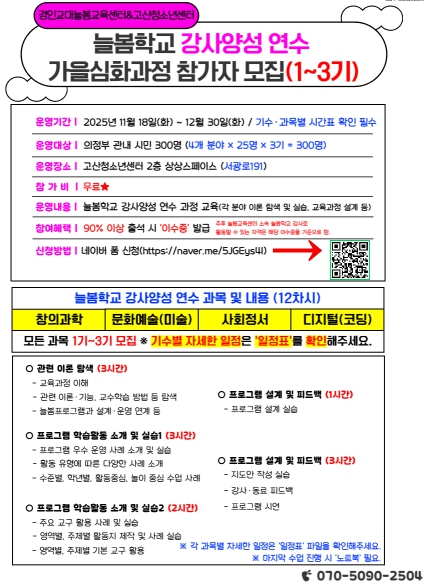 교육은 11월 18일부터 12월 30일까지 고산청소년센터 상상스페이스에서 무료로 진행되며, 창의과학·문화예술·사회정서·디지털 등 4개 분야에서 기수별 25명씩 총 300명을 선발한다.