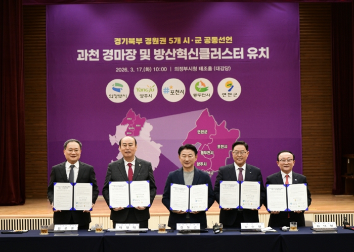 [뉴스노크=김인호 기자] 포천시는 17일 의정부시청 태조홀에서 경기북부 경원권 5개 시군(포천·의정부·양주·동두천·연천)과 함께 ‘과천경마공원 이전 및 방산혁신클러스터 유치’를 위한 공동선언식을 개최했다.