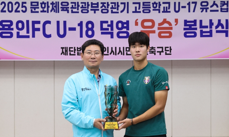 [뉴스노크=김인호 기자] 용인특례시는 7일 오후 용인미르스타디움에 있는 용인시시민프로축구단 회의실에서 이상일 시장이 참석한 가운데 ‘2025 문화체육관광부장관기 고등학교 U-17 유스컵’ 우승컵 봉납식을 개최했다.
