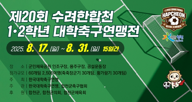 [뉴스노크=김인호 기자] 합천군은 17일부터 31일까지 15일간 ‘수려한합천 제20회 1‧2학년 대학축구연맹전’을 군민체육공원 인조구장, 용주구장, 공설운동장에서 개최한다고 밝혔다.