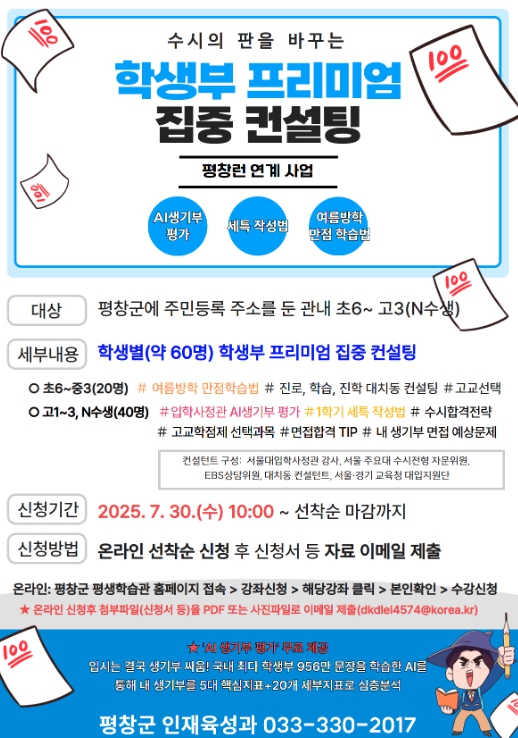 이번 컨설팅은 평창런 참여자뿐만 아니라 일반학생까지 대상을 확대해 관내 초등학교 6학년부터 중학교 3학년까지는 여름방학 학습전략, 학습로드맵 수립, 전공 적합성을 높이는 비교과활동 가이드, 표준화심리검사 7종 분석상담 등 일대일 맞춤 컨설팅을 지원한다.