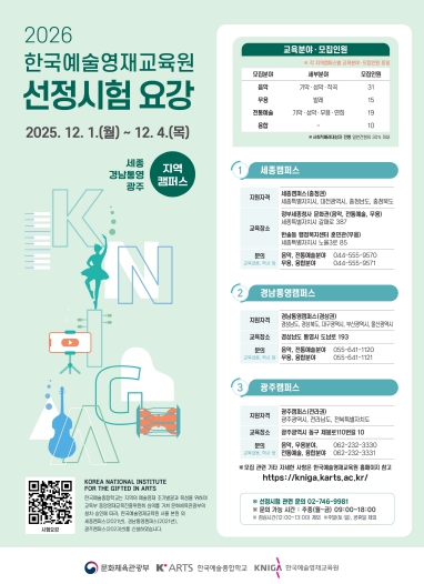 [뉴스노크=김인호 기자] 광주광역시는 한국예술종합학교 부설기관인 한국예술영재교육원 광주캠퍼스의 2026년도 교육생을 오는 12월 1일부터 4일까지 모집한다고 13일 밝혔다.