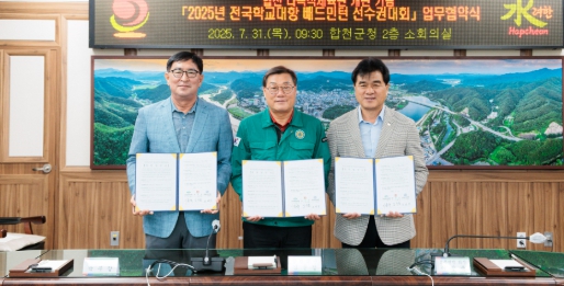 [뉴스노크=김인호 기자] 합천군은 7월 31일 목요일 오전 9시 30분, 군청 2층 소회의실에서 한국초등배드민턴연맹(회장 이용국), 경남배드민턴협회(회장 이만기)와 ‘2025 전국학교대항 배드민턴 선수권대회(초등)’ 유치 협약을 체결했다고 밝혔다.
