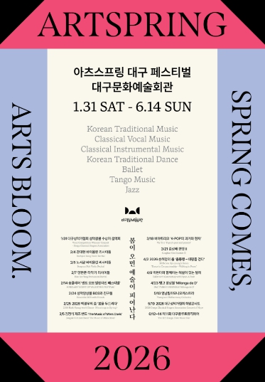 [뉴스노크=김인호 기자] 대구문화예술회관은 대구를 기반으로 활동하는 지역 예술인들의 공연을 한데 모아 그들의 예술혼을 집중 조명하는 축제 '2026 아츠스프링 대구 페스티벌'의 16개 공연을 오는 1월 31일부터 6월 14일까지 대구문화예술회관에서 개최한다고 밝혔다.