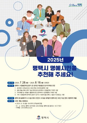 추천은 시민 30인 이상의 연대 서명을 받아 추천서를 작성 제출하면 되며, 관련 서식은 평택시청 누리집 ‘고시공고’ 게시판에서 내려받을 수 있다. 추천 접수는 7월 28일부터 8월 18일까지 진행된다.