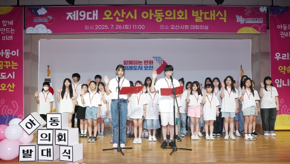 발대식은 “함께 만드는 미래, 아동이 꿈꾸는 도시 오산”이라는 슬로건 아래 초등학교 3학년부터 고등학교 2학년까지 총 38명으로 구성된 제9대 오산시 아동의회 의원들과 가족들이 함께 모여 진행됐다.