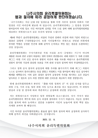 윤리특별위원회는 입장문에서 “나주시의회는 지난 12월 5일 입장문을 통해 이번 사안의 경과와 의회의 기본 입장을 시민 여러분께 발표한 바 있다”며 “윤리특별위원회는 그 입장을 엄중히 받아들이며, 이번 일로 시민 여러분께 심려를 끼쳐 드린 점에 대해 윤리특별위원회를 대표하는 위원장으로서 깊은 유감의 말씀을 드린다”고 전했다.