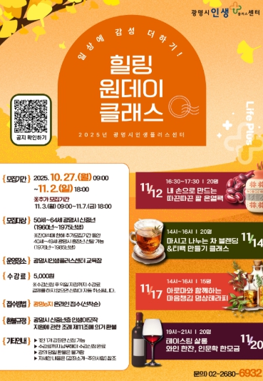 [뉴스노크=김인호 기자] 광명시 인생플러스센터가 오는 11월 12일부터 20일까지 신중년의 정서적 힐링과 문화 감수성 향상을 위한 ‘일상에 감성 더하기! : 힐링 원데이 클래스’를 운영한다.