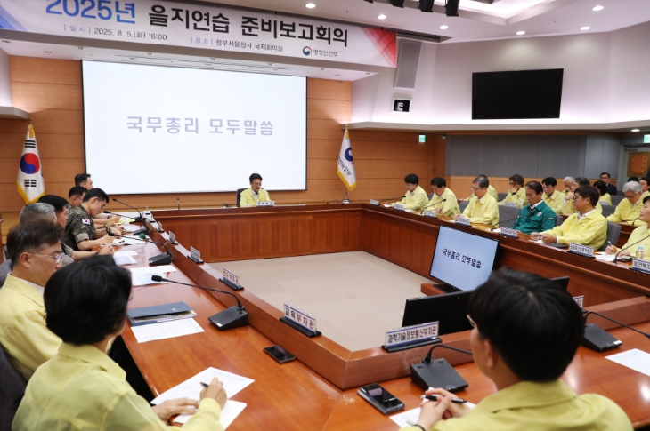 [뉴스노크=김인호 기자] 김민석 국무총리는 8월 5일 오후 정부서울청사에서 중앙행정기관장, 시·도지사, 군 지휘관 등이 참석한 가운데 2025년도 을지연습 준비보고회의를 주재했다.