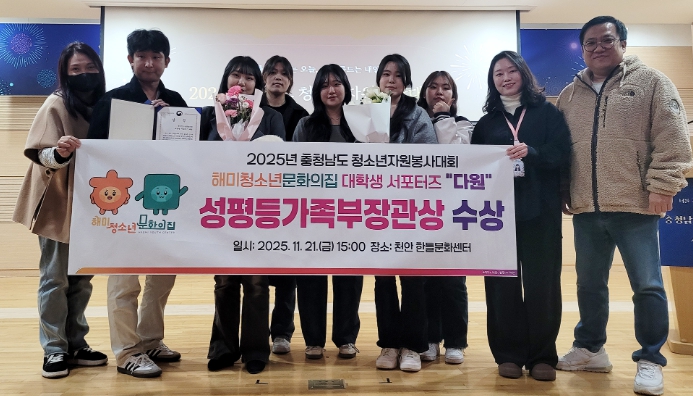 [뉴스노크=김인호 기자] 해미청소년문화의집은 지난 21일 성평등가족부와 충청남도가 주최한 2025년 충남청소년자원봉사대회에서 대학생 서포터즈 ‘다원’이 동아리 부문에서 성평등가족부장관상을 수상했다고 밝혔다.