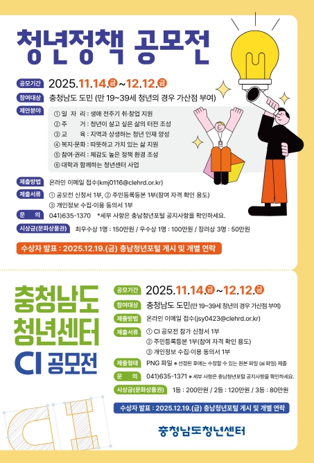 청년정책 공모전 수상자에게는 문화상품권(최우수 150만원·우수 100만원·장려 50만원)이 지급되며, 수상 결과는 12월 19일 충남청년포털을 통해 발표된다.