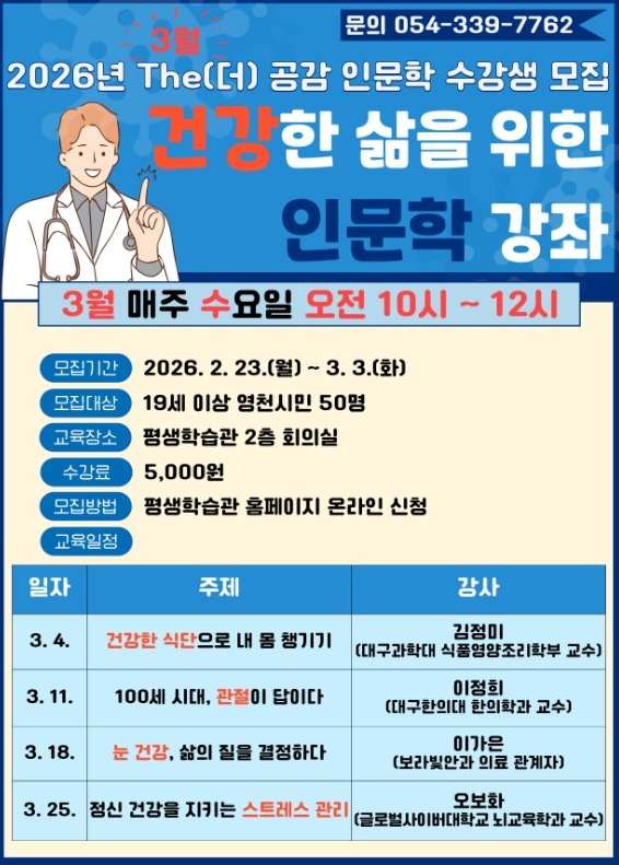 [뉴스노크=김인호 기자] 영천시 평생학습관(관장 정경자)은 시민의 인문학적 소양 함양을 위해 운영하는 ‘The(더) 공감 인문학 특강’ 3월 수강생을 23일부터 다음 달 3일까지 모집한다.