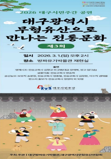 [뉴스노크=김인호 기자] 대구문화예술진흥원 박물관운영본부 소속 대구방짜유기박물관에서는 2026년 대구시민주간(2.21.~28.)을 맞아 3월 1일 오후 2시, 박물관 재현실에서 대구의 전통문화를 알리는 특별 공연 ‘대구광역시 무형유산으로 만나는 전통문화’를 개최한다.