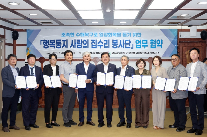 원활한 사업 추진을 위해 북구는 30일 오후 2시 북구청 상황실에서 건우 봉사단·금융기관·자활센터·지역 대학 등 총 10개 기관과 함께 ‘행복둥지 사랑의 집수리 봉사단’ 구성에 따른 업무협약을 체결하고 침수 주택 수리를 위한 공동 대응 체계를 구축한다.