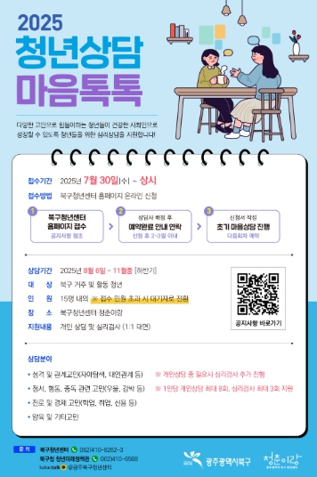 [뉴스노크=김인호 기자] 광주시 북구가 청년들의 마음 건강을 돌보고 심리적 안정을 도모하기 위해 2025년 하반기 ‘청년상담 마음톡톡’ 프로그램 운영에 나선다고 6일 밝혔다.