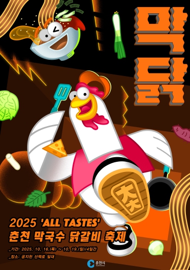 올해 축제 이름은 ‘All tastes, 2025 춘천막국수·닭갈비축제’로 정하고 메인 로고 슬로건은 “막닭을 ‘맞닥’ 뜨렸을 때, 온몸으로 전해지는 맛의 전율!”로 확정했다. 춘천을 대표하는 두 음식의 정체성을 젊고 감각적인 언어로 표현해 국내외 관광객의 이목을 끌 계획이다.