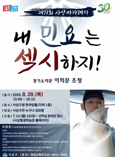 [뉴스노크=김인호 기자] 부산 사상구는 오는 8월 28일 오후 3시, 사상구청 한마당홀에서 소리꾼 이희문을 초청해 제71회 사상아카데미를 개최한다.