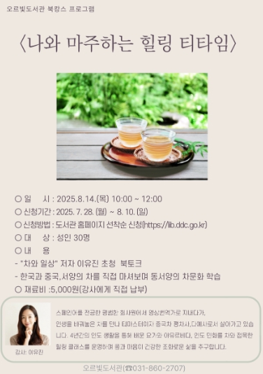 도서관 관계자는 “바쁜 일상 속 여유를 찾고 싶은 시민들에게 차와 책을 통한 새로운 힐링 기회를 제공할 것으로 기대한다”라며 “앞으로도 시민을 위한 다양한 치유형 독서문화 프로그램을 마련하겠다”라고 말했다.