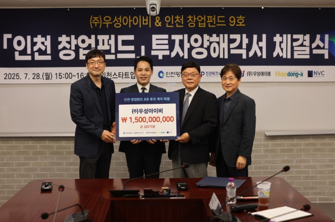 | ▲ 지난 28일 개최된 ‘인천 창업펀드 9호’ 투자계약 체결식 왼쪽부터 정승수 인천TP 벤처창업사업단장, 이강식 ㈜우성아이비 부사장, 이희재 ㈜우성아이비 대표, 유동식 인천TP 벤처투자지원센터 차장 |