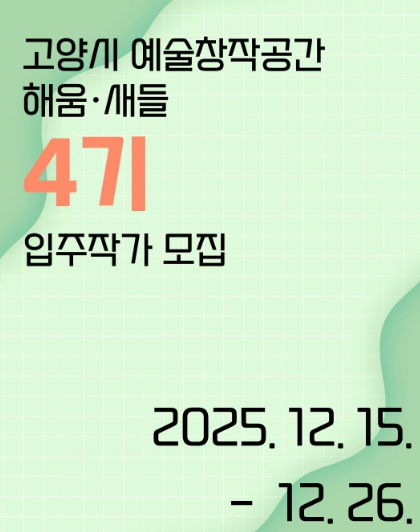 [뉴스노크=김인호 기자] 고양특례시는 지역 미술 생태계를 활성화하고 작가들의 안정적인 창작 활동을 지원하기 위해 오는 26일까지‘고양시 예술창작공간 해움·새들’ 제4기 입주작가를 공개 모집한다고 밝혔다.