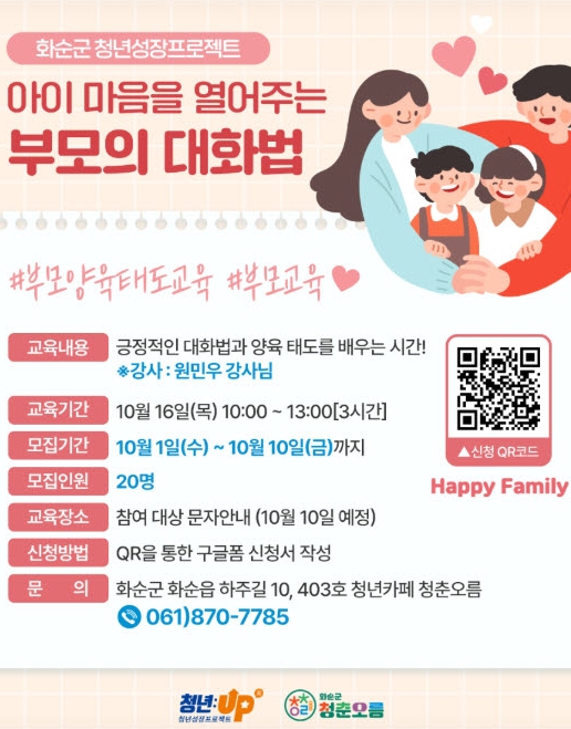 [뉴스노크=김인호 기자] 화순군은 2일 청년성장 프로젝트 공모사업의 일환으로 개인별 맞춤형 부모 교육 프로그램을 진행한다고 밝혔다.