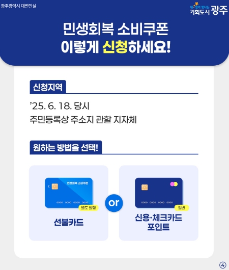 [뉴스노크=김인호 기자] 광주광역시는 민생경제 회복과 지역 골목상권 활성화를 위해 마련한 ‘민생회복 소비쿠폰’ 신청을 21일부터 시작한다.