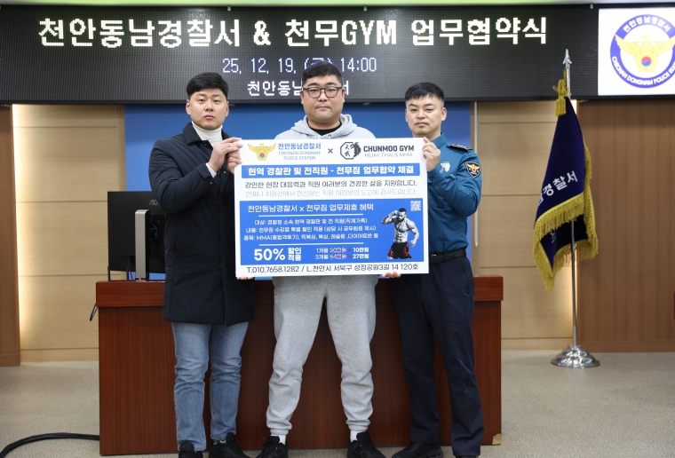 [뉴스노크=김인호 기자] 천안 동남경찰서(서장 송해영)는 2025년 12월 19일(금) 오후 2시, 천안동남경찰서 중회의실에서 무에타이·MMA 전문 체육관인 ‘천무짐’(관장 문보람)과 ‘경찰관 체력 증진 및 복지 향상’을 위한 업무협약(MOU)을 체결했다고 밝혔다.