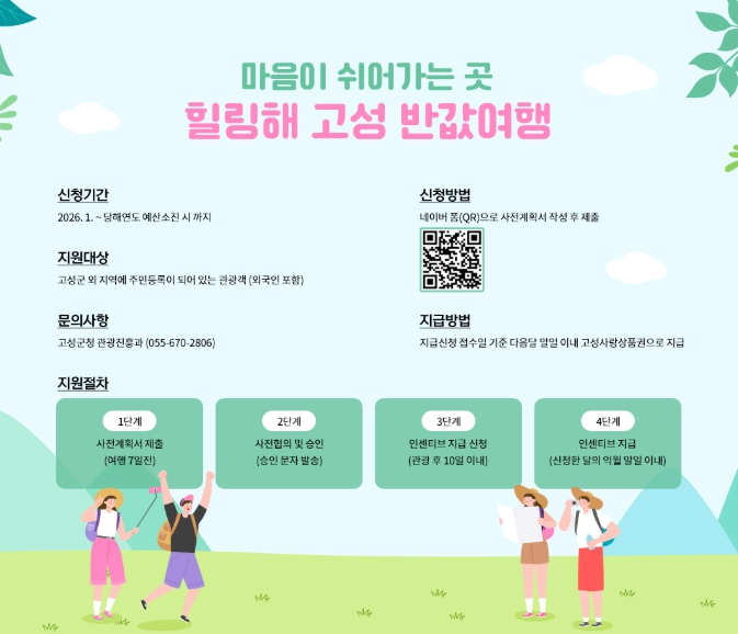 [뉴스노크=김인호 기자] 고성군은 관광객 유치증대 및 체류형 관광 활성화로 지역경제에 활력을 불어넣기 위해 2026년 신규사업으로 ‘마음이 쉬어가는 곳, 힐링해 고성 반값여행’을 시행한다고 밝혔다.