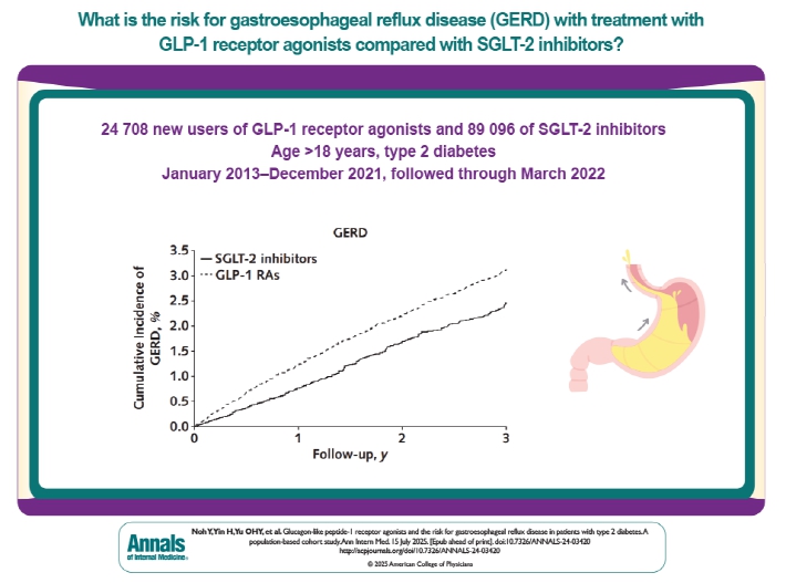 GLP-1 RA(관심약물)는 혈당 조절과 체중 감량은 물론, 심혈관 및 신장 보호 효과 등 다양한 임상적 이점을 제공하는 약물로 알려져 있다. 그러나 이번 연구는 기존에 잘 알려진 위장관 관련 부작용(오심, 구토, 위 정체 등)과 더불어 위식도역류질환 발생 가능성에 대한 주의가 필요함을 시사한다. 특히 위식도역류질환 고위험군에 해당하는 당뇨병 환자에게 GLP-1 RA를 처방하는 경우 위식도역류질환 발생 가능성을 염두에 두어, 필요시 사전 예방이나 조기 치료 전략을 고려할 수 있다.