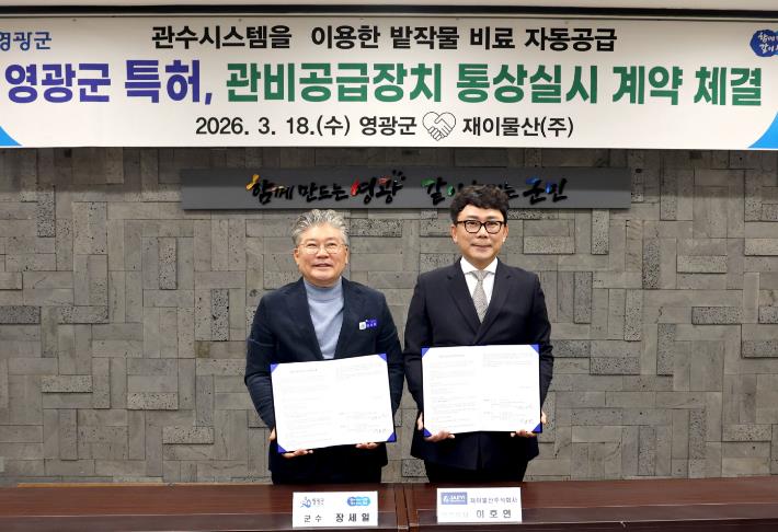 [뉴스노크=김인호 기자] 영광군은 지난 18일 전북 군산시에 위치한 재이물산(주)과 ‘관비공급장치’ 특허에 대한 통상실시권 계약을 체결했다고 밝혔다.