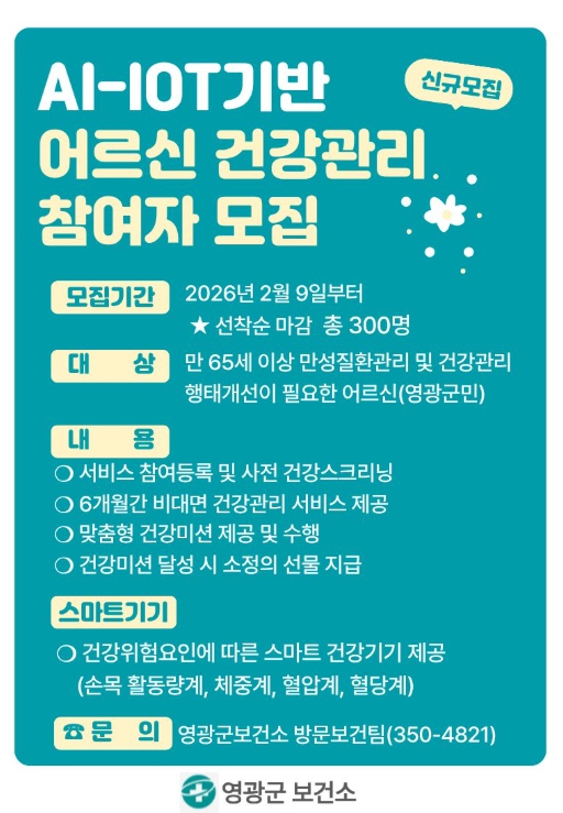 [뉴스노크=김인호 기자] 영광군은 초고령화 시대에 대비해 65세 이상 영광군민을 대상으로 AI・IoT(인공지능사물인터넷)기반 어르신 건강관리사업 신규 참여자 300명을 2월 9일부터 선착순 모집한다고 밝혔다.