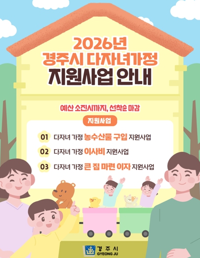 주낙영 경주시장은 “다자녀 가정이 안정적으로 생활할 수 있도록 주거와 생활 전반을 아우르는 지원을 강화했다”며 “아이 낳고 키우기 좋은 도시 환경을 조성하기 위해 실효성 있는 대응정책을 지속적으로 추진하겠다”고 말했다.