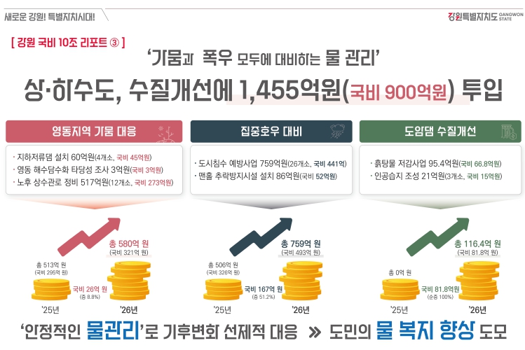 [뉴스노크=김인호 기자] 강원특별자치도는 내년도에 1,455억 원을 투입하여 가뭄 및 집중호우 등 물로 인한 기후변화와 자연재해로부터 안전한 강원자치도를 만들어 나갈 계획을 밝혔다.
