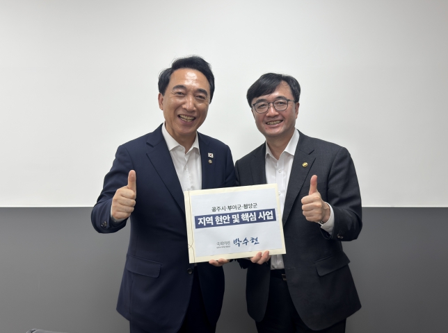 한편 박수현 국회의원은 국정기획위원회 국가균형성장특별위원장으로서 대한민국 균형성장 전략의 청사진을 설계하고, 이재명 대통령의 지역 공약을 구체화·유형화해 국정과제를 수립했다. 현재 내년도 예산 반영을 위해 재정당국과 긴밀히 협의 중이며, 최근 임기근 기획재정부 2차관 등과 잇따라 면담을 갖고 공주·부여·청양 핵심사업 예산 반영을 강력히 요청하는 등 발로 뛰고 있다.