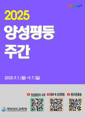 [뉴스노크=김인호 기자] 경상남도교육청은 양성평등 주간(9월 1일~7일)을 맞아 학생들의 양성평등 의식을 높이고, 학교 현장에서 성인지 감수성을 확산하기 위해 다양한 교육 행사를 운영한다.
