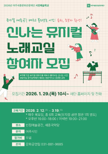 [뉴스노크=김인호 기자] 여주세종문화관광재단은 오는 12일부터 시민예술학교 프로그램의 일환으로 ‘신나는 뮤지컬 노래교실’을 운영한다.