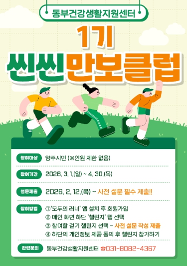 [뉴스노크=김인호 기자] 양주시보건소 동부 건강생활지원센터에서는 지역 주민의 건강생활실천율 향상 및 비만율 개선을 위해 2026년도 ‘씬씬 만보클럽’ 1기 참여자를 모집한다.