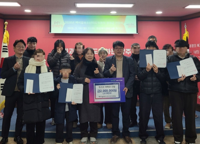 [뉴스노크=김인호 기자] 백석읍 청소년지도위원회가 4일 지역 내 학생 4명에게 총 200만 원의 장학금을 전달했다.
