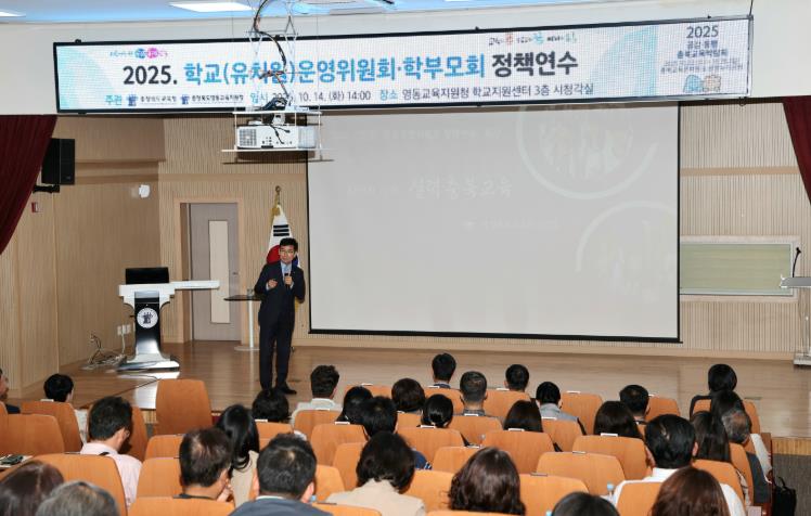 [뉴스노크=김인호 기자] 충청북도영동교육지원청은 14일 영동교육지원청 학교지원센터 3층 시청각실에서 관내 유·초·중·고등학교 운영위원, 학부모회 임원, 학교(원)장, 행정실장 120여 명을 대상으로 2025. 학교(유치원)운영위원회·학부모회 정책연수를 실시했다.