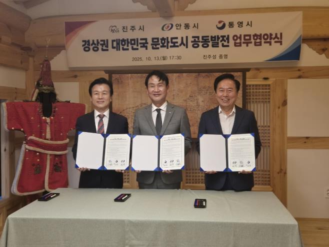 통영시는 지난 13일 진주성 중영에서 통영시 부시장, 진주시장, 안동시장이 참석한 가운데 경상권 문화도시의 공동 발전을 위한 업무협약을 체결했다.