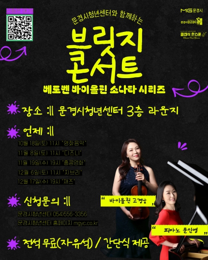 [뉴스노크=김인호 기자] 문경시청년센터는 오는 10월부터 12월까지 문경시청년센터 3층 라운지에서 클래식을 주제로 한‘브릿지 콘서트’를 연다.