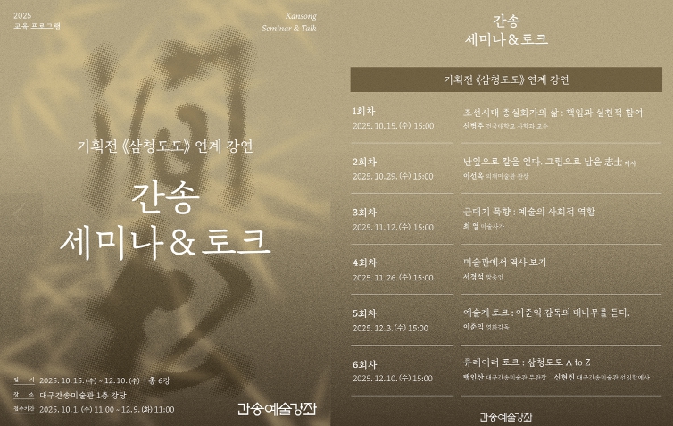 [뉴스노크=김인호 기자] 대구간송미술관은 광복 80주년 기념 기획전 《삼청도도 – 매·죽·난, 멈추지 않는 이야기》와 연계하여 ‘간송예술강좌: 세미나 · 토크’를 운영한다.