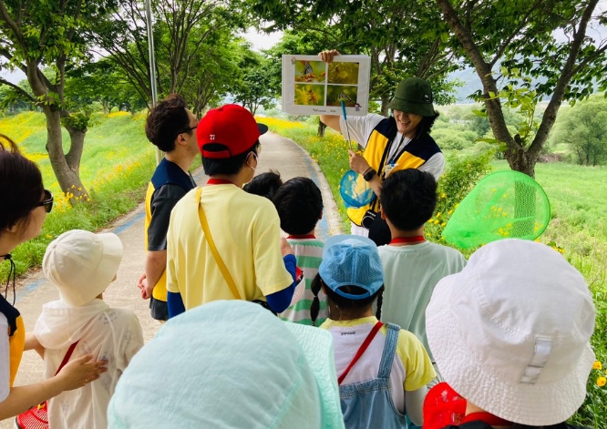 ▲ 학교 밖 마을교육의 일환으로 섬진강 생태습지를 견학하는 어린이들